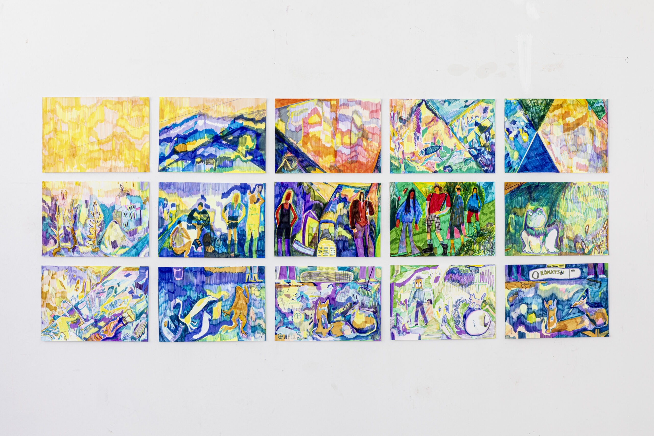 Cette expérience m’a permis de découvrir les Grisons, la région la plus orientale de la Suisse. Fascinée par la beauté des paysages, j’ai souhaité m’imprégner de la mythologie locale pour réaliser une série de tableaux fragmentés. Ces œuvres mêlent personnages, touristes, animaux mythologiques et les habitants qui façonnent la région — notamment les ouvriers qui construisent les routes ou encore la femme de ménage de la résidence, que j’ai placée au centre du récit.
